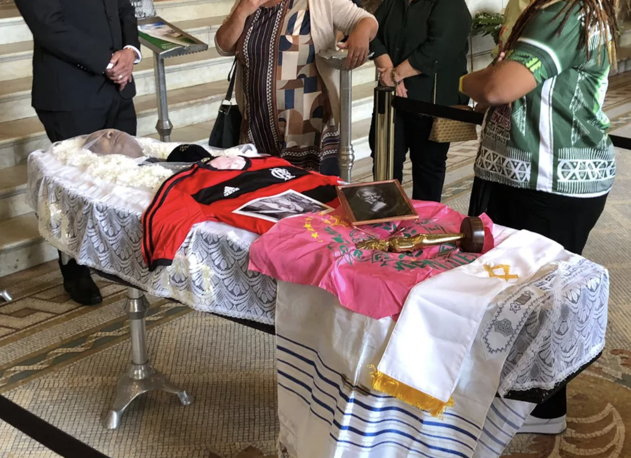 Uma camisa do Flamengo, time de coração do veterano, foi colocada sobre o caixão. Fãs também deixaram uma bandeira e um boné.