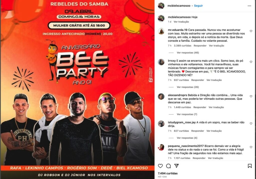 MC Biel Xcamoso era conhecido por seu estilo único de brega funk e suas postagens nas redes sociais sobre sua rotina e shows. Em suas últimas postagens, ele compartilhou sobre seu último show em uma boate na cidade de Piedade e mostrou garrafas de uísque em seu último story no Instagram. Veja vídeos: