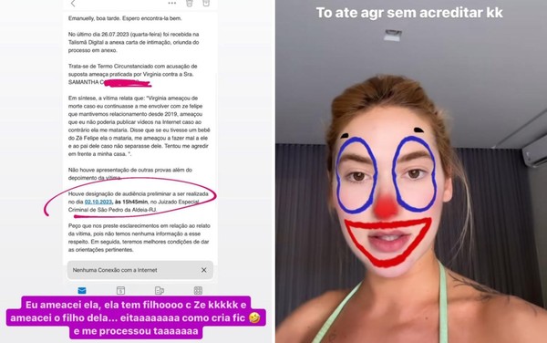 “Virginia me ameaçou de morte caso eu continuasse a me envolver com Zé Felipe, mantivemos relacionamento desde 2019. Ela ameaçou que eu não poderia publicar vídeos na Internet, caso o contrário, ela me mataria. Disse que se eu tivesse um bebê do Zé Felipe, ela o mataria, me ameaçou a fazer mal a ele e ao pai dele caso não separasse dele. Tentou me agredir em frente a minha casa”, disse a suposta vítima.