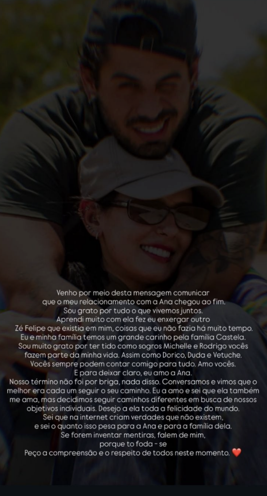 “Venho por meio desta mensagem comunicar que o meu relacionamento com a Ana chegou ao fim. Sou grato por tudo o que vivemos juntos. Aprendi muito com ela fez eu enxergar outro Zé Felipe que existia em mim, coisas que eu não fazia há muito tempo”, começava o texto publicado pelo cantor. Os dois confirmaram o romance em outubro, depois de alguns meses de rumores de affair.