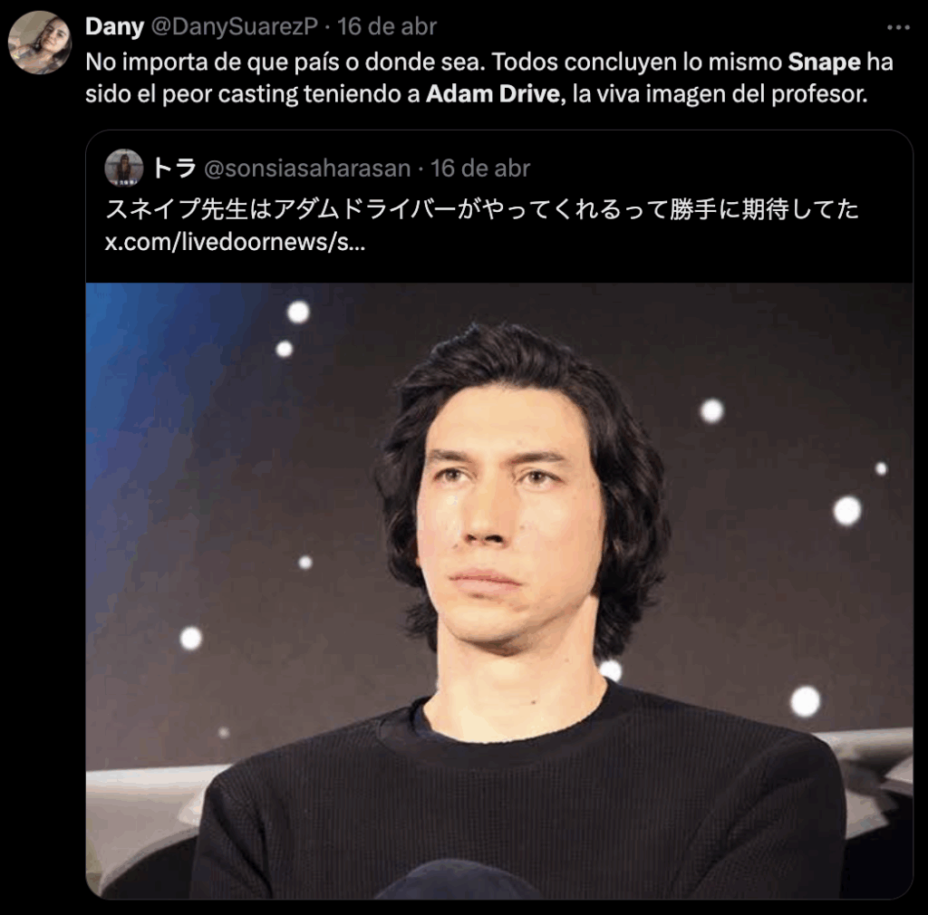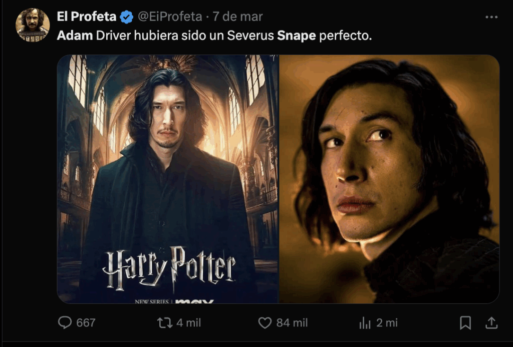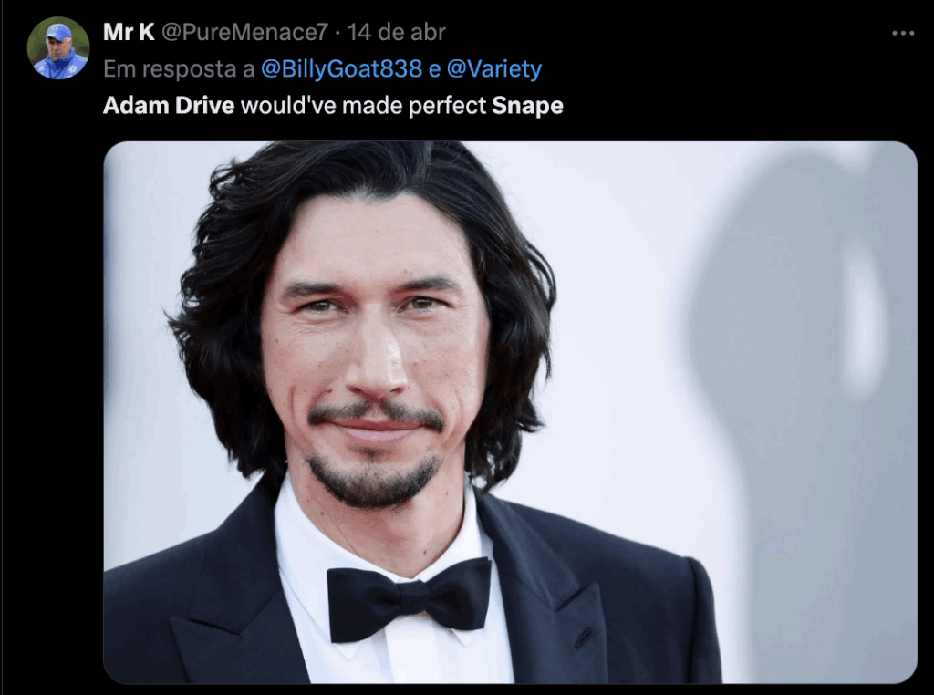 Em meio à controvérsia, o nome de Adam Driver ganhou força como a escolha preferida dos fãs para interpretar Snape. Conhecido por papéis intensos em Star Wars (como Kylo Ren) e Marriage Story, Driver é elogiado por sua capacidade de encarnar personagens emocionalmente complexos, com uma presença física que muitos consideram próxima da descrição de Snape. “Adam Driver tem o olhar penetrante, a postura melancólica e a intensidade que Snape exige. Ele seria perfeito”, escreveu um fã no X.