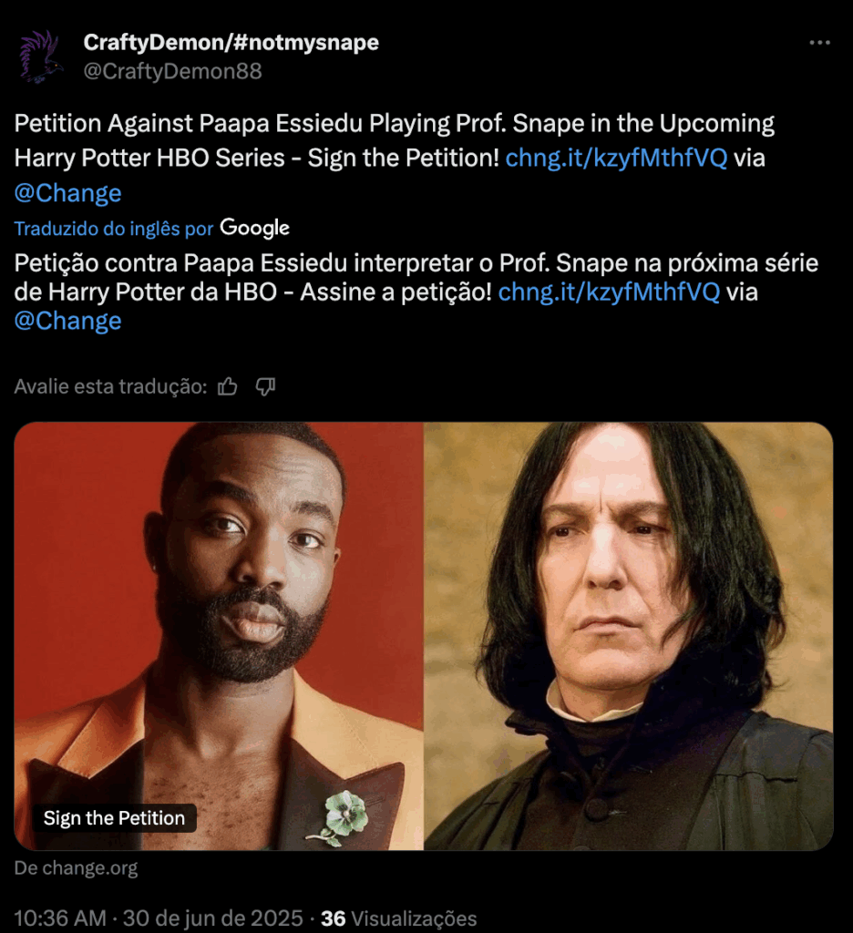 Fãs apontam que Essiedu, embora talentoso, não se encaixa na descrição física detalhada nos livros. Um usuário do X escreveu: “Snape é descrito como pálido, com cabelo preto e um ar sombrio. Escalar Paapa Essiedu parece uma escolha forçada para agradar a diversidade, ignorando a essência do personagem.” Outros acusam a HBO de “lacração”, termo usado para criticar decisões percebidas como motivadas por agendas políticas em vez de fidelidade à obra original.
