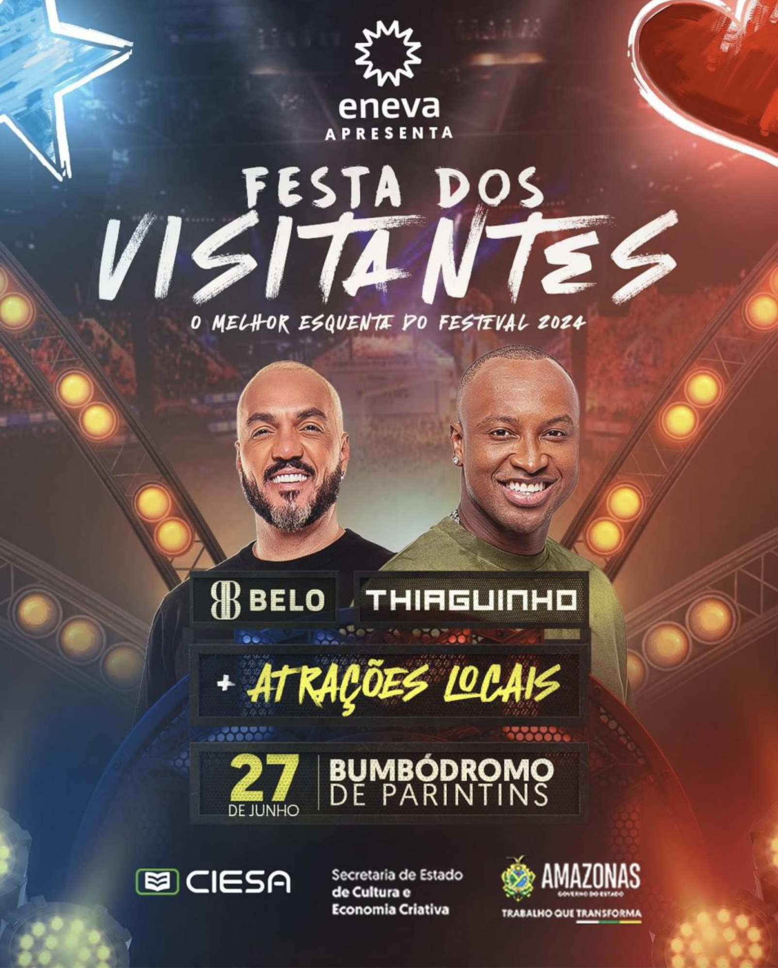 Amazonas – O acesso à edição de 2024 da Festa dos Visitantes, em Parintins (distante 369 quilômetros de Manaus), que este ano terá como atrações nacionais os cantores Thiaguinho e Belo, será feito com a troca de ingresso por dois (2) quilos de alimentos não perecíveis, nos dias 25 e 27 de junho. Este ano o ponto de troca será na Escola Estadual São José Operário, na rua Oneldes Martins, na Ilha Tupinambarana.