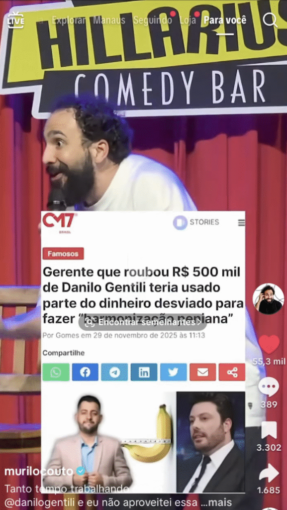 Brasil – O comediante Murilo Couto tem chamado a atenção nas redes sociais e nos palcos ao repercutir a reportagem publicada pelo portal CM7 Brasil que trata do desvio de mais de R$ 500 mil no My Fucking Comedy Club, casa de shows e bar de comédia do apresentador e humorista Danilo Gentili, em São Paulo.