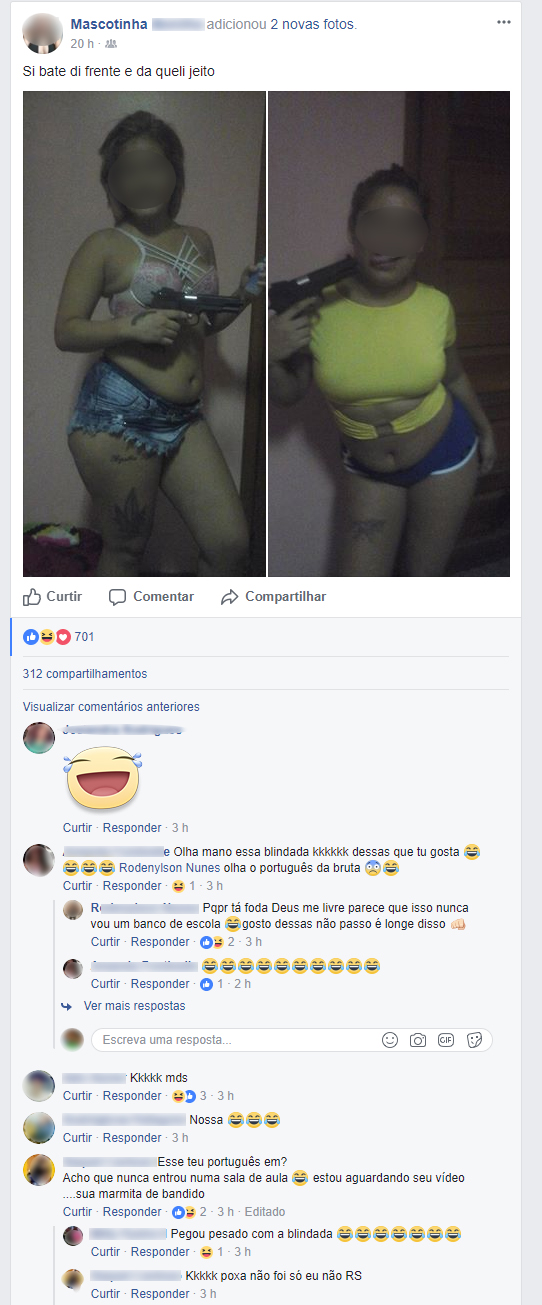 Uma jovem conhecida como Mascotinha, postou em sua página no Facebook, duas imagens onde aparecem ela e outra jovem, segurando uma suposta pistola e os seguintes dizeres “Si bate di frente e da queli jeito “.