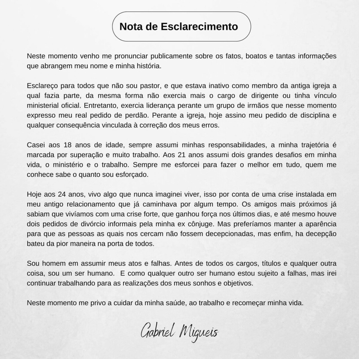 Gabriel Migueis utilizou o espaço para afirmar que não possui vínculo institucional com a igreja, porém comanda um grupo de irmãos do qual ele aproveitou o ensejo para pedir desculpas. “Assino meu pedido de disciplina e qualquer consequência vinculada à correção dos meus erros”, escreveu.