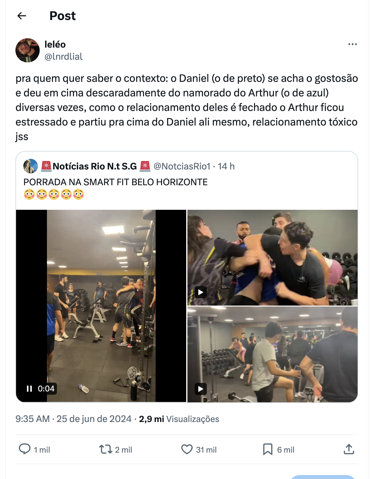 Brasil – Um vídeo que circula nas redes sociais nesta terça-feira (25) mostra o momento em que dois homens saem no soco dentro de uma unidade da academia Smart Fit, em Belo Horizonte. Supostamente, a confusão foi motivada por ciúmes de um terceiro rapaz.