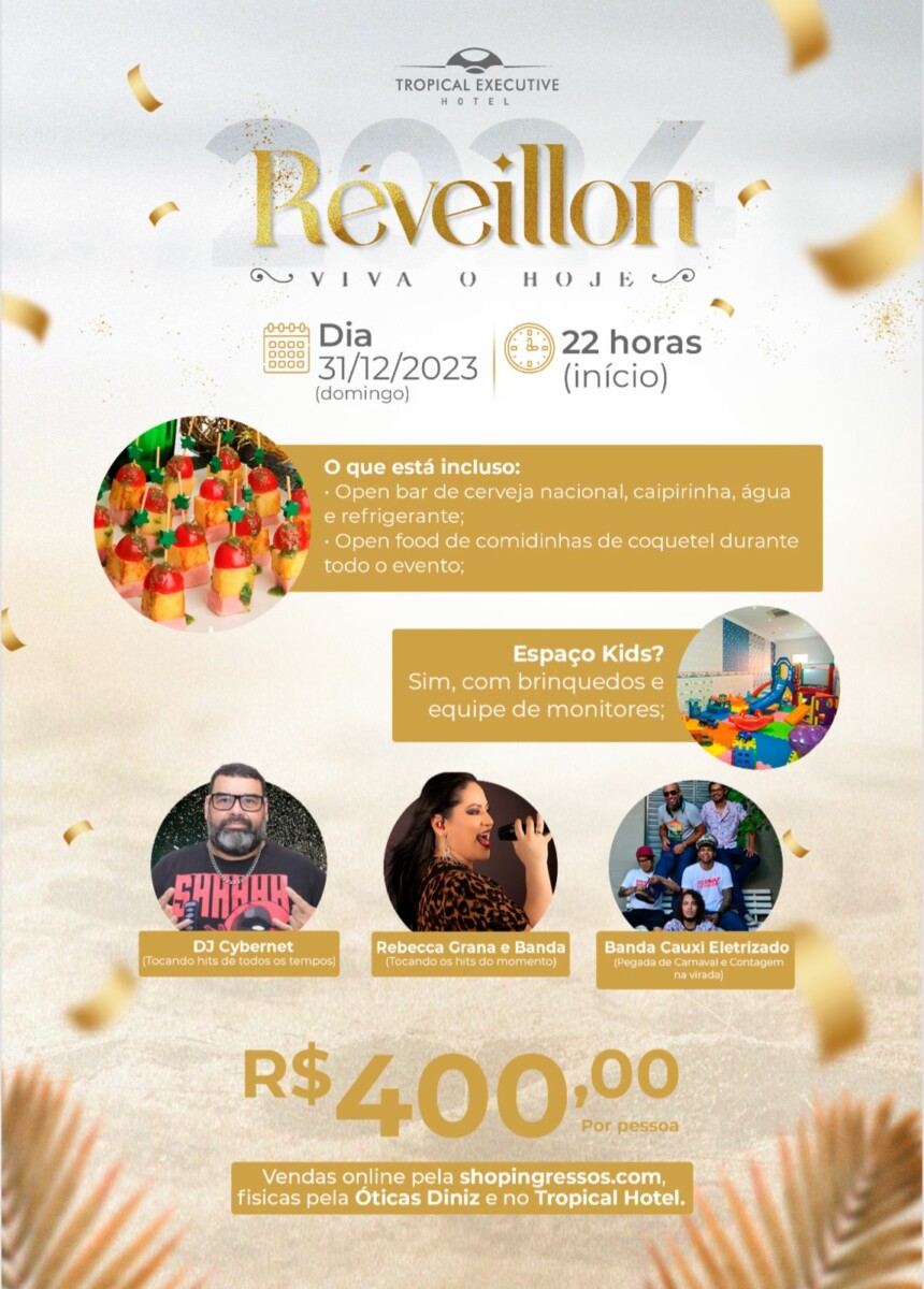 No dia 31 de dezembro, das 22h às 3h, o Hotel Tropical Executive será palco de uma celebração única. O evento oferece um pacote completo para garantir uma noite especial: open bar com cerveja nacional, caipirinha, água e refrigerante, além de um open food com deliciosas comidinhas de coquetel durante toda a festa.