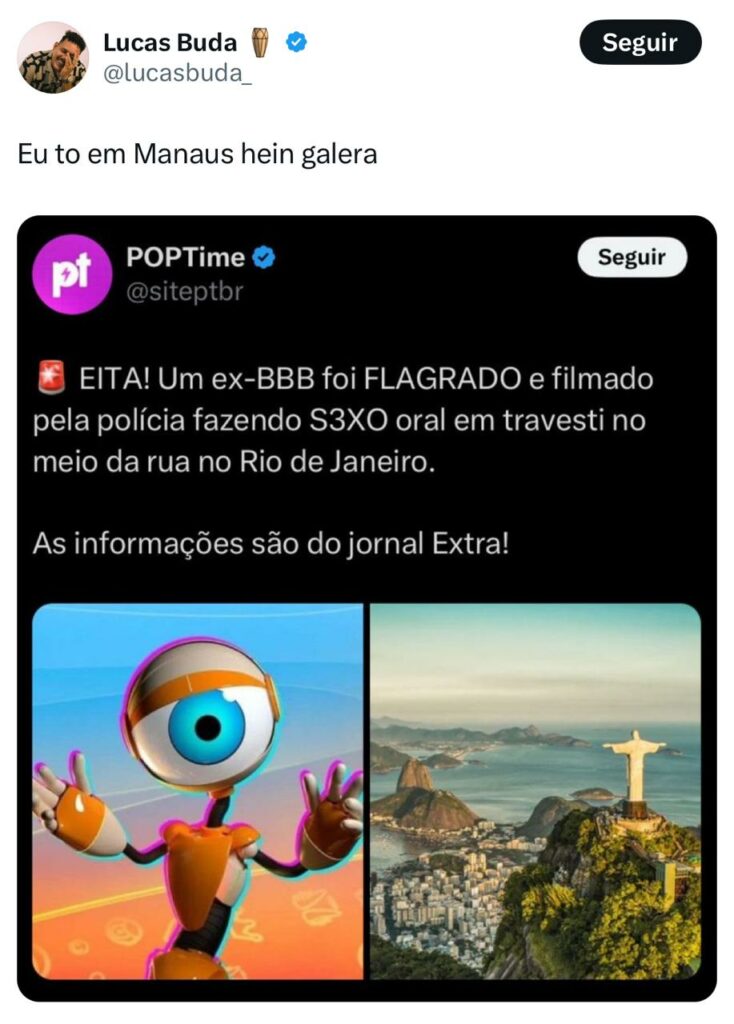 “Só no glub-glub”: após um ex-BBB ser flagrado com travesti no RJ, Lucas Buda se pronuncia; veja