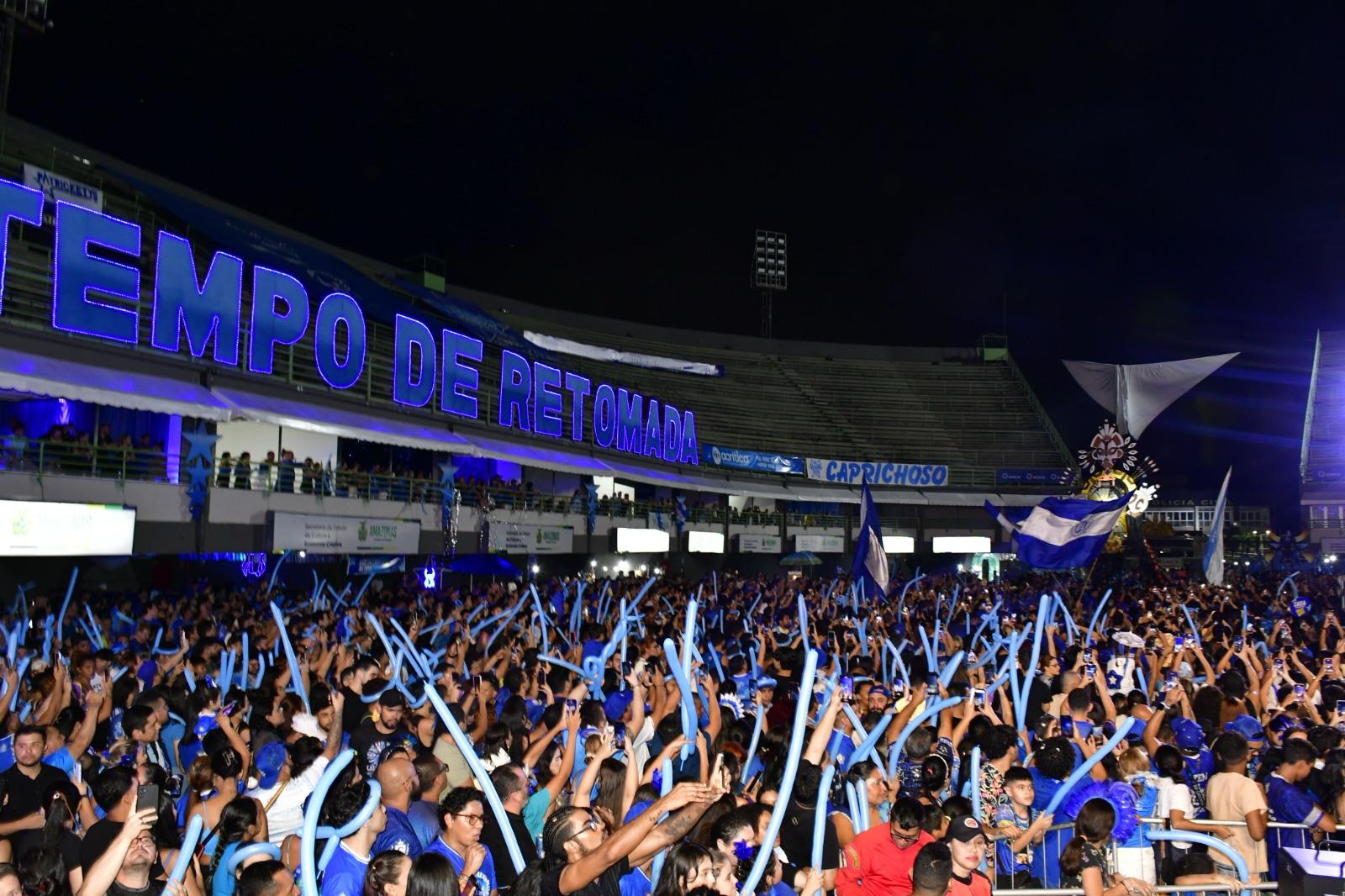 Manaus – O Boi Caprichoso transformou o lançamento do álbum 2025 “É Tempo de Retomada” em uma celebração memorável com dois dias de festa no Sambódromo de Manaus. Previsto inicialmente para acontecer no sábado (26), o evento precisou ser estendido até o domingo (27), devido a forte chuva que atingiu a cidade, mas nem mesmo o tempo afastou a Nação Azul e Branca, que demonstrou sua paixão inabalável.