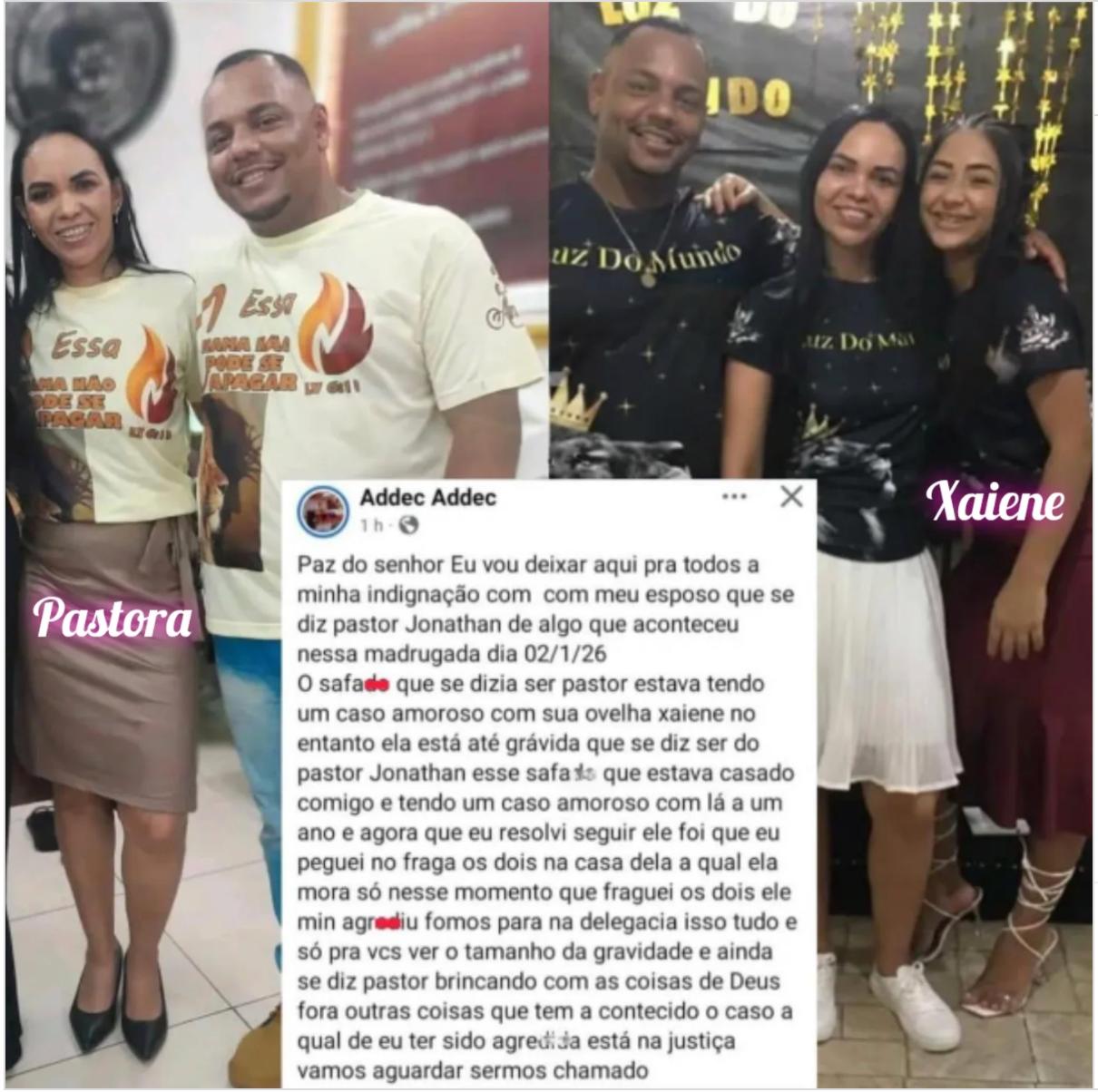 Brasil – Um caso de traição envolvendo um pastor está viralizando nas redes sociais. Nesta quarta-feira (28), veio à tona o relato da varoa Elisângela, que descobriu que seu marido, o líder religioso Jonathas, estava traindo-a com uma discípula da igreja, identificada como Xaiene.