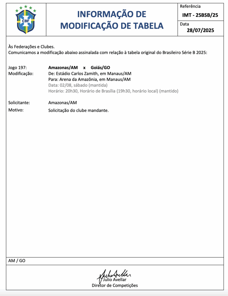 A alteração ocorre por solicitação do Amazonas. Na atual Série B, a Onça-pintada atuou apenas duas vezes na Arena da Amazônia: empatou em 0 a 0 com a Ferroviária, na segunda rodada, e perdeu por 2 a 0 para o Avaí, na quarta rodada.