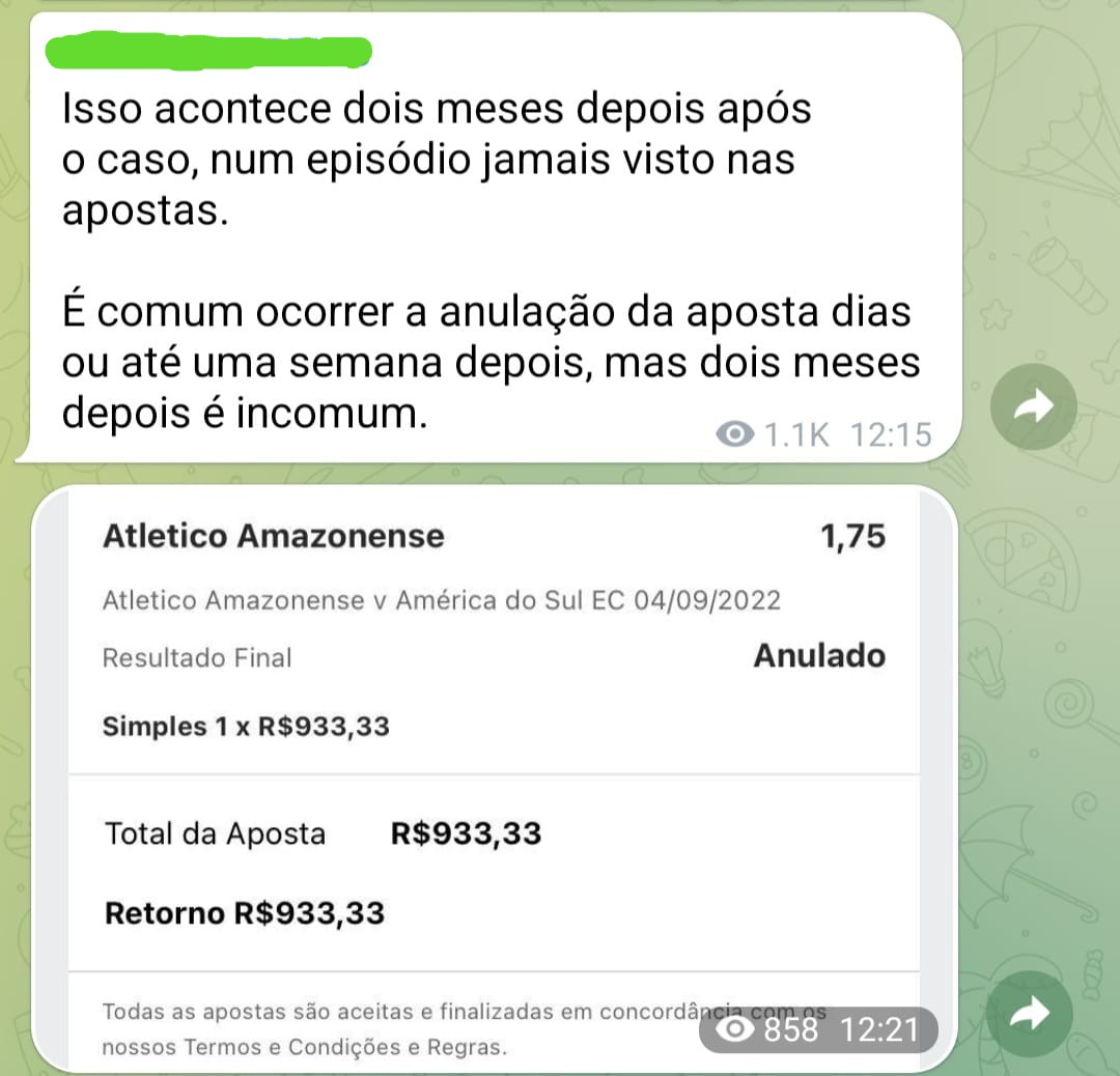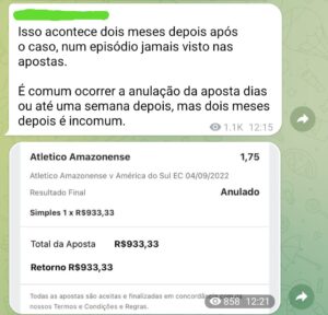 Em prints de grupos de dicas esportivas, um homem fica espantado com a anulação da aposta e diz que nunca viu isso após tanto tempo.