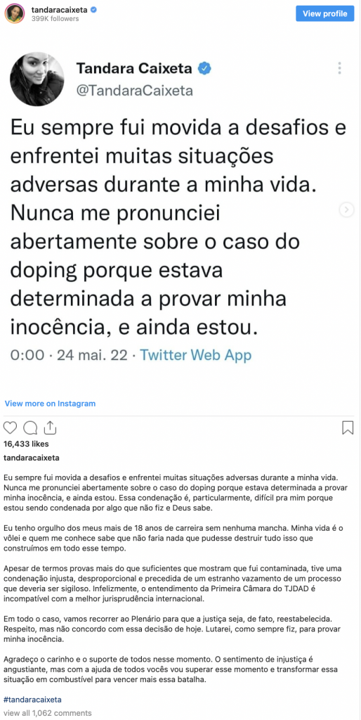 Brasil – Após oito horas de julgamento no Tribunal de Justiça Desportiva Antidopagem, a jogadora Tandara Caixeta foi condenada por doping, pelo uso de Ostarina, e está suspensa por quatro anos – a pena máxima. Os três auditores foram unânimes. A atleta ainda tem direito de recorrer à Corte Arbitral do Esporte (CAS), na Suíça.