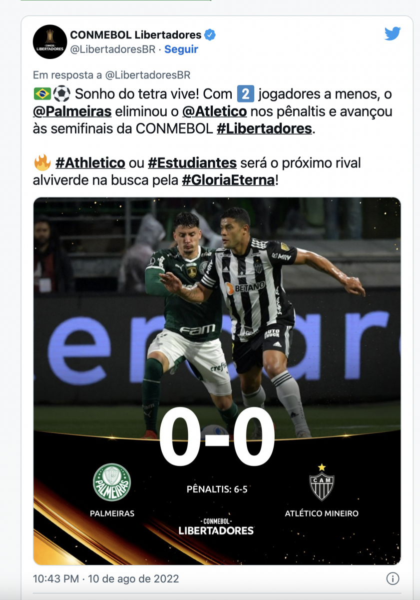 Brasil – Após um novo empate sem gols, o Palmeiras bateu o Atlético-MG por 6 a 5 na disputa de pênaltis e se classificou para as semifinais da Copa Libertadores na noite desta quarta-feira (10) no Allianz Parque, em São Paulo.