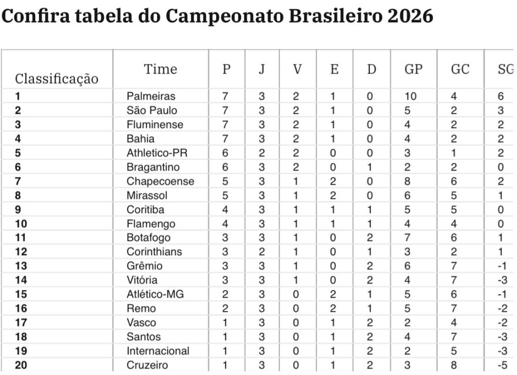 Com os resultados, o Palmeiras lidera com sete pontos, ao lado de São Paulo, Fluminense e Bahia. O Athletico aparece com seis pontos e 100% de aproveitamento. Já o Botafogo soma três pontos, enquanto o Santos segue na parte de baixo da tabela.
