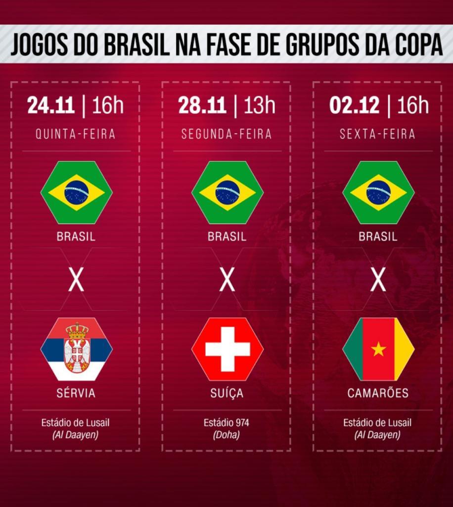 Veja os dias e horários de jogos do Brasil na fase de grupos: