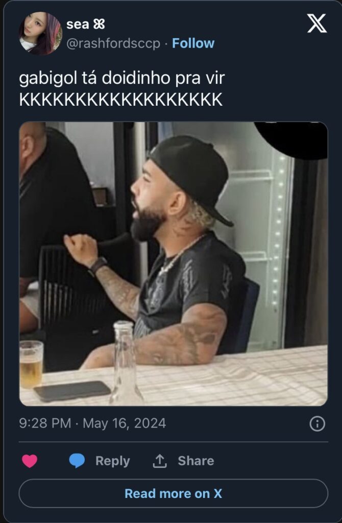 Segundo o jornalista Venê Casagrande, a foto foi registrada nesta quinta-feira. Vale ressaltar que nesta quarta-feira, o jogador esteve em campo pelo Flamengo na partida da Libertadores.