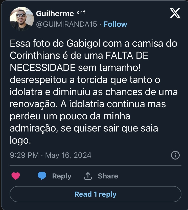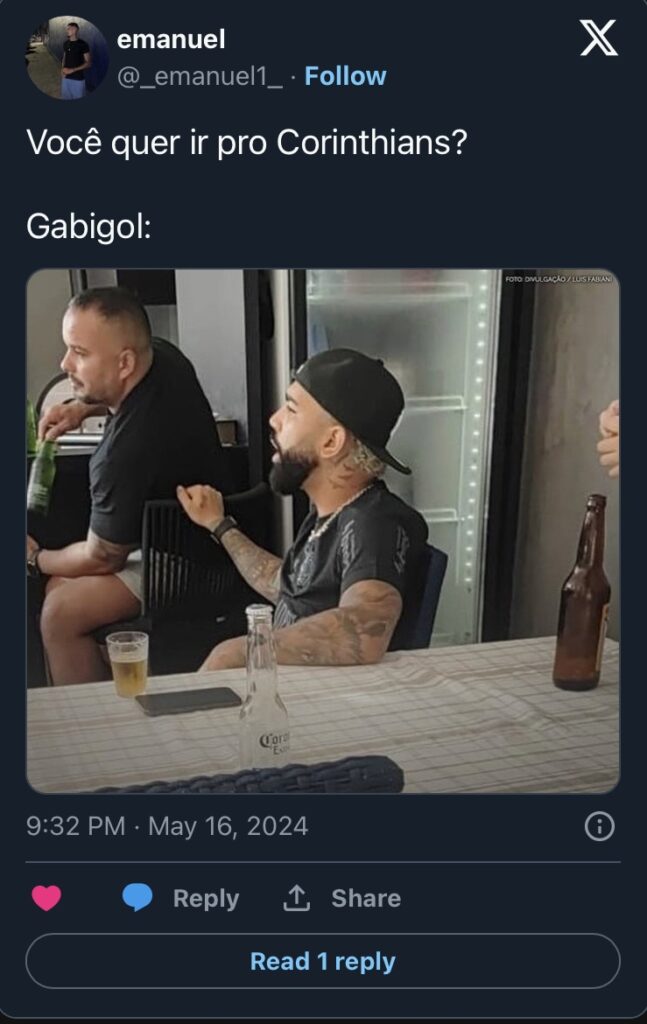 A foto de Gabigol gerou agitação e curiosidade entre os torcedores do Corinthians, que especulam sobre o futuro do jogador. Enquanto isso, entre os torcedores do Flamengo, a reação foi de desagrado, com alguns chegando a afirmar que o jogador perdeu sua idolatria no clube.