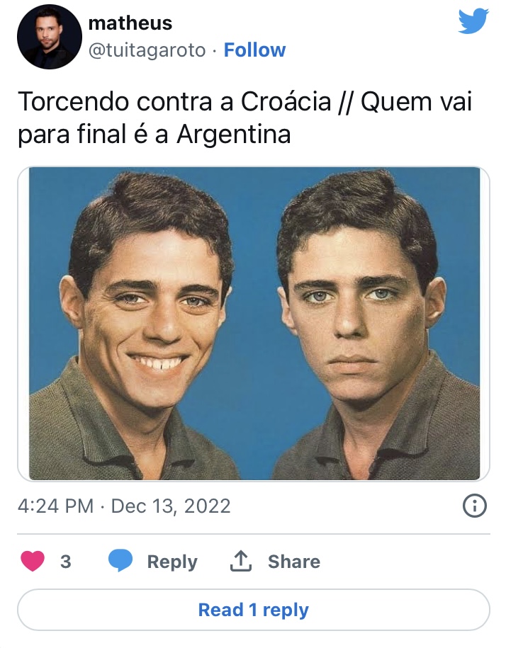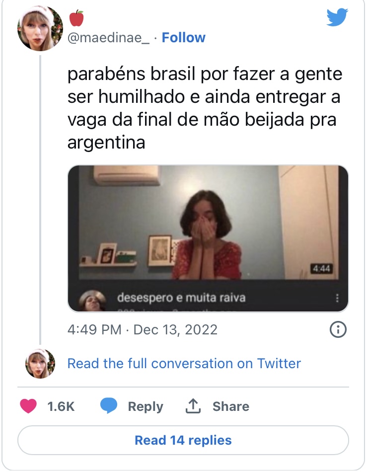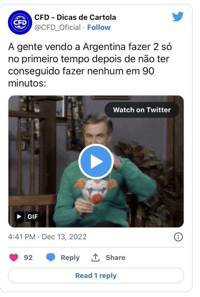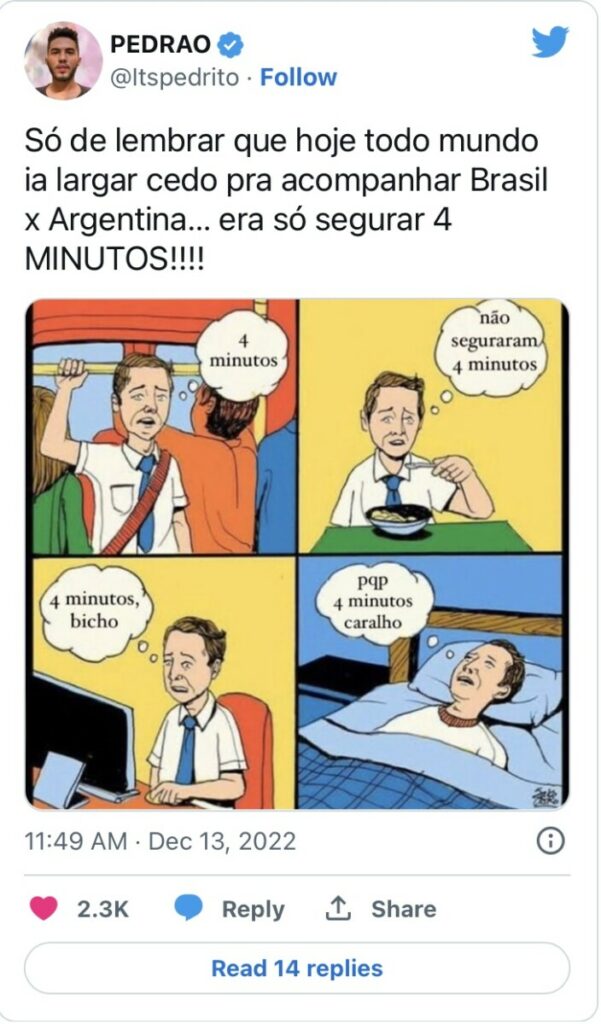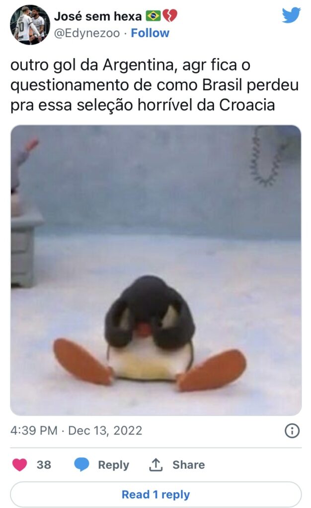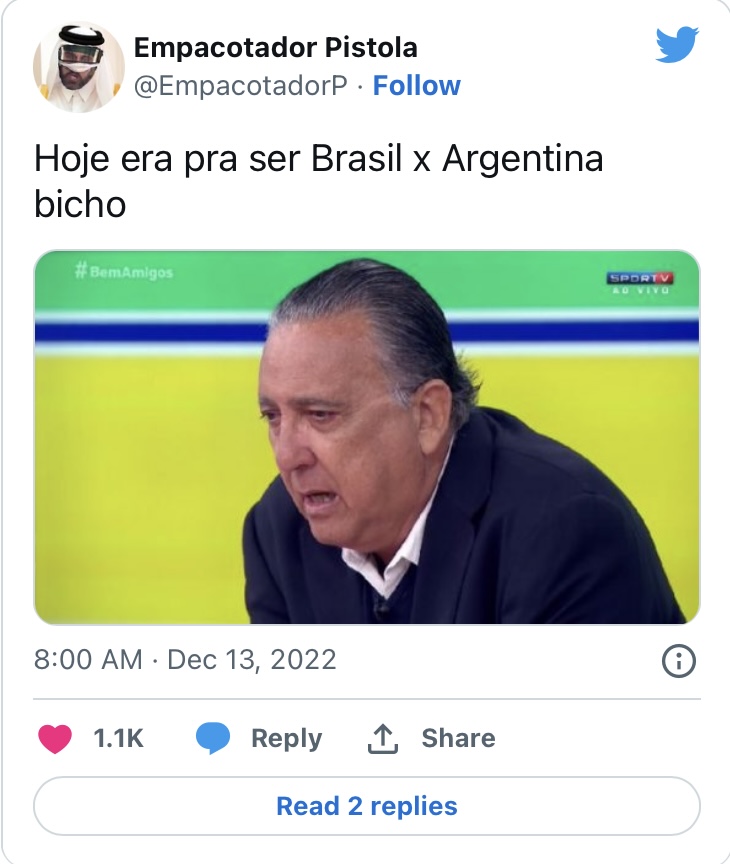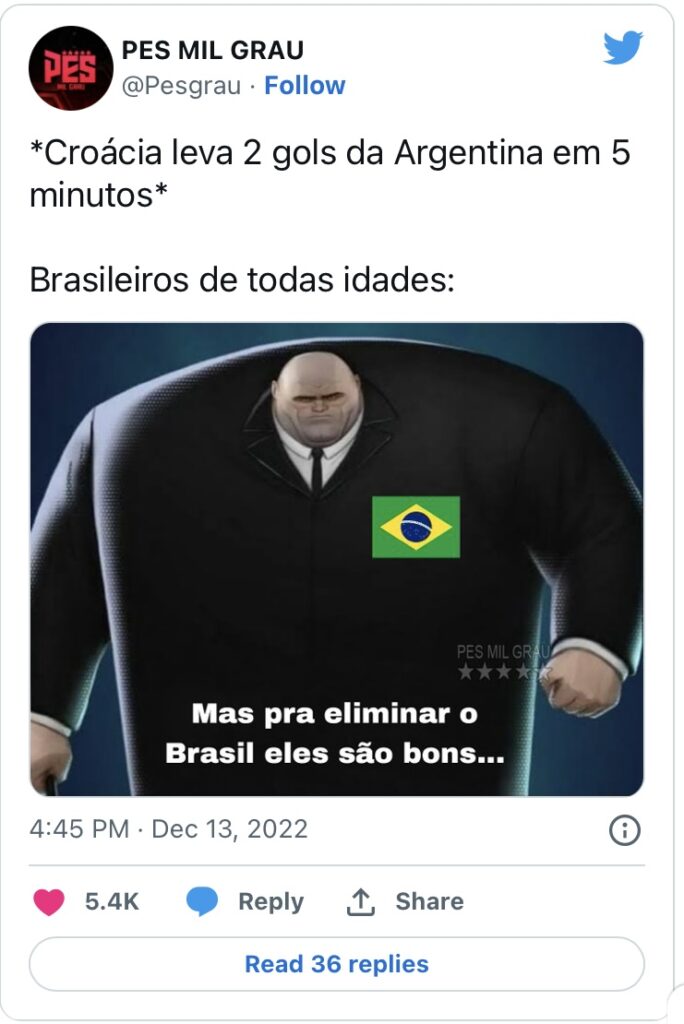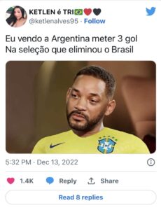 Enquanto a bola rolava no Catar, brasileiros comentam o jogo nas redes sociais e compartilham uma série de memes. Ainda abalados com a eliminação do Brasil – que, se tivesse vencido a Croácia na última sexta-feira (9), estaria enfrentando a Argentina hoje.