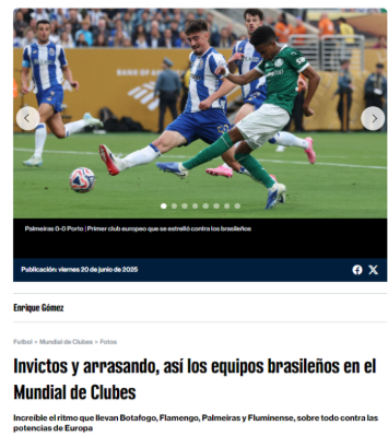 “Invictos e arrasadores: assim estão os times brasileiros no Mundial de Clubes. O ritmo de Botafogo, Flamengo, Palmeiras e Fluminense é incrível, principalmente contra as potências europeias”, escreveu o portal do Fox Deportes, canal no idioma espanhol feito nos Estados Unidos.
