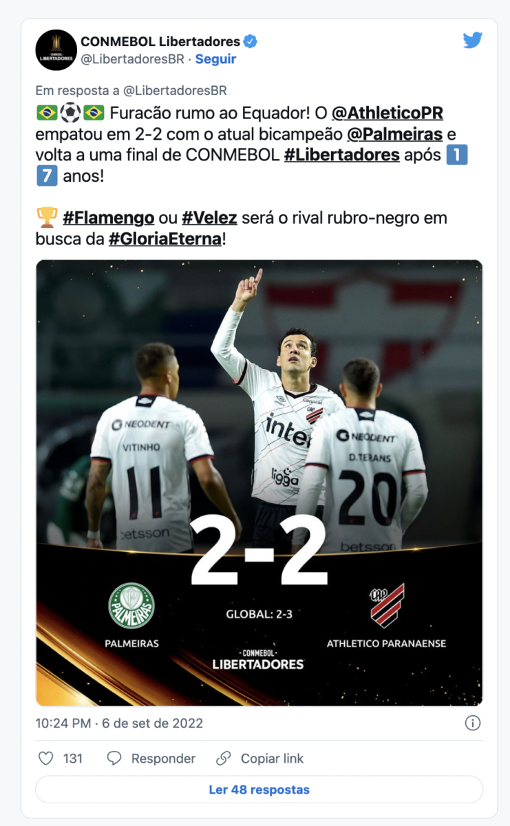 Brasil – Após 17 anos, o Athletico-PR está de volta à final da Libertadores. Nesta terça-feira (6), o Furacão empatou por 2 a 2 com o Palmeiras no Allianz Parque, em São Paulo, no segundo jogo da semifinal. A equipe rubro-negra fez valer a vantagem conquistada na partida de ida, há uma semana, na Arena da Baixada, em Curitiba, onde venceu por 1 a 0.