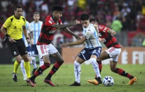 O Grêmio não suportou. Depois de troca de passes entre Bruno Henrique e Gabigol, Arrascaeta recebeu livre, na marca do pênalti, e apenas bateu para o gol vazio para marcar o terceiro, aos 20 minutos.