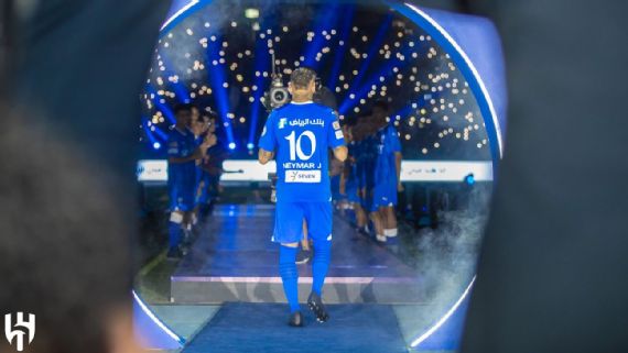 Após cumprimentar jovens torcedores do Al Hilal, o brasileiro caminhou até o centro de campo e viu os drones formarem a mensagem: “Neymar is blue”, ou “Neymar é azul”, em referência à cor do time.
