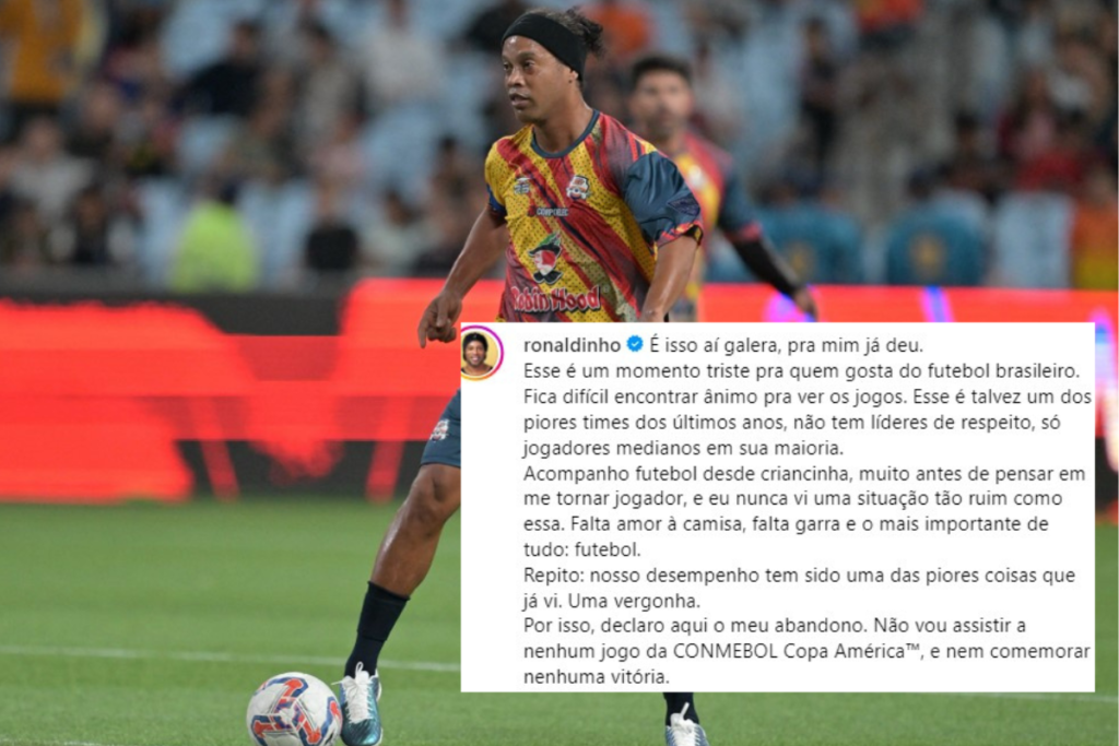 “Acompanho futebol desde criancinha, muito antes de pensar em me tornar jogador, e eu nunca vi uma situação tão ruim como essa. Falta amor à camisa, falta garra e o mais importante de tudo: futebol. Repito: nosso desempenho tem sido uma das piores coisas que já vi. Uma vergonha. Por isso, declaro aqui o meu abandono. Não vou assistir a nenhum jogo da Copa América, e nem comemorar nenhuma vitória”, finalizou Ronaldinho.