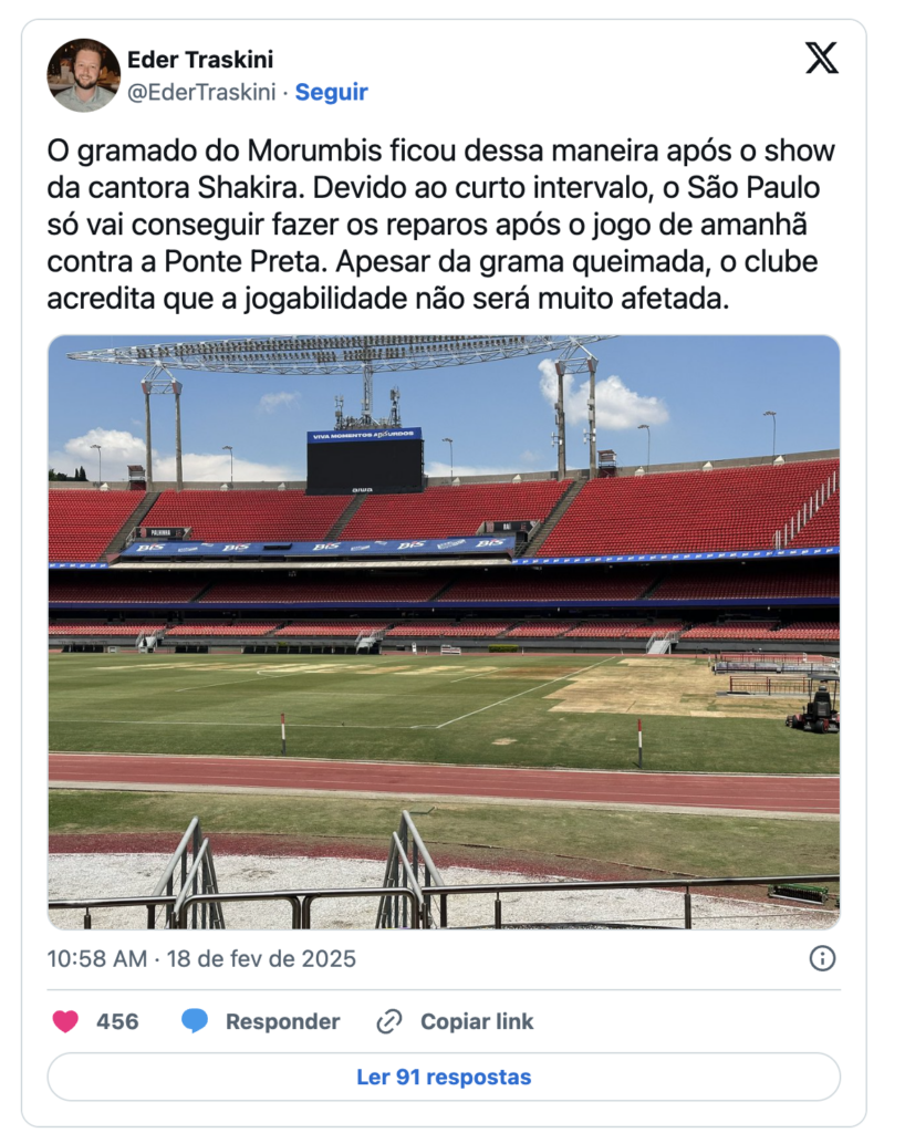 Brasil – O gramado do estádio do São Paulo – Morumbis, ficou bastante castigado após o show único realizado por Shakira no último dia (13). Embora a maior parte da estrutura para a apresentação tenha ficado em uma área atrás de um dos gols, o desgaste dentro das quatro linhas foi maior do que o previsto.