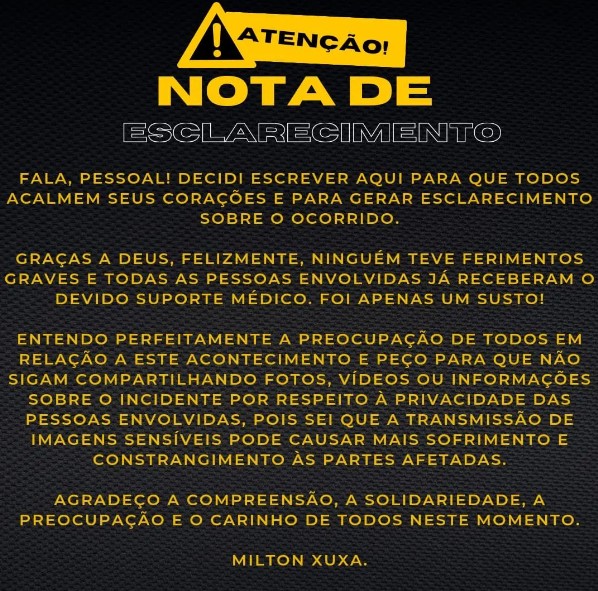 No vídeo, Xuxa informou que está bem, após ter recebido atendimento médico em uma unidade hospitalar. Ele não entrou em detalhes sobre como o acidente aconteceu, mas assegurou que todos os envolvidos receberam cuidados médicos e que o estado de saúde das pessoas feridas é estável.