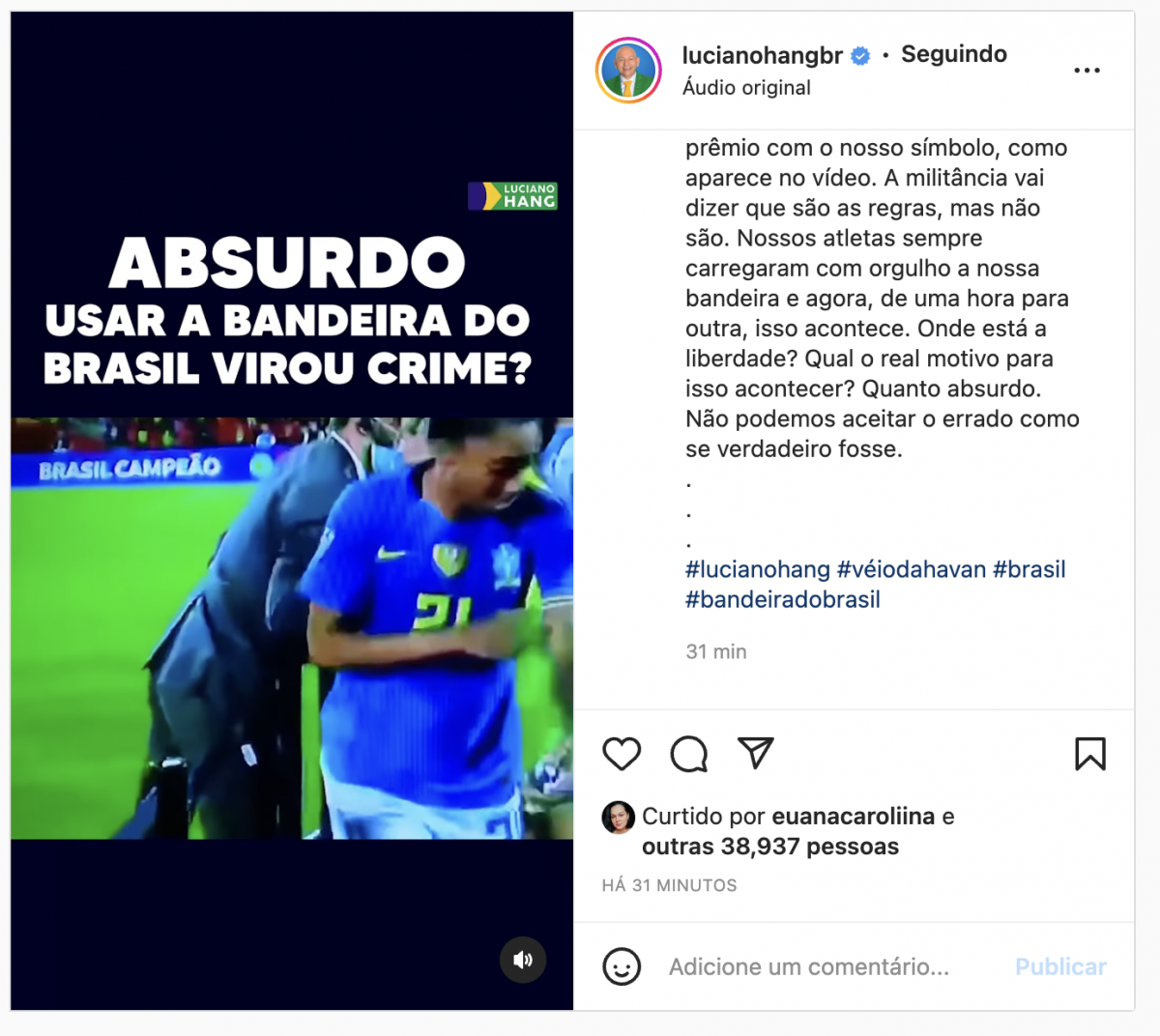 “Usar a bandeira do Brasil virou crime? Vejam o que aconteceu com a seleção feminina de futebol, essa semana, na Colômbia. O time foi campeão da Copa América e na hora das jogadoras receberem o troféu e as medalhas, as duas atletas que estavam com a Bandeira do Brasil foram impedidas de receberem o prêmio com o nosso símbolo, como aparece no vídeo. A militância vai dizer que são as regras, mas não são. Nossos atletas sempre carregaram com orgulho a nossa bandeira e agora, de uma hora para outra, isso acontece. Onde está a liberdade? Qual o real motivo para isso acontecer? Quanto absurdo. Não podemos aceitar o errado como se verdadeiro fosse”, disse o empresário.