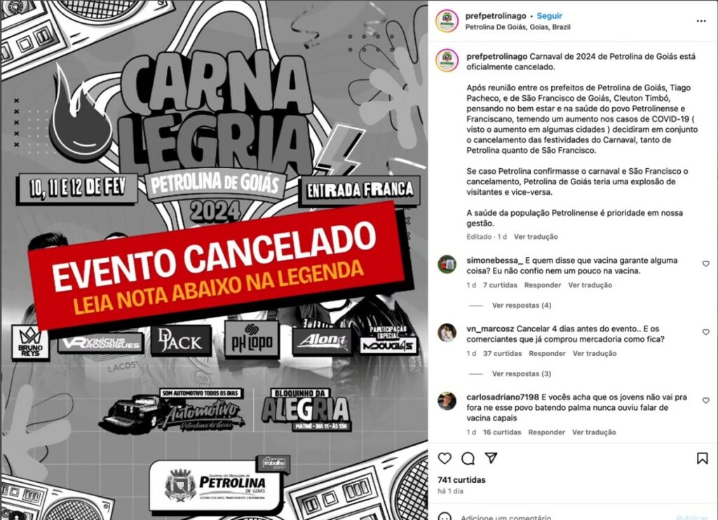 A preocupação com a disseminação do coronavírus também levou outras cidades goianas, como Petrolina de Goiás e São Francisco de Goiás, a cancelarem suas festividades carnavalescas. Em comunicados oficiais, as prefeituras destacaram a importância da medida para proteger a saúde da população diante do atual cenário epidemiológico.