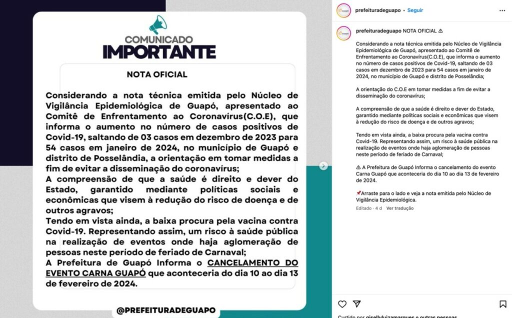 Na cidade de Guapó, localizada na região metropolitana da capital goiana, a Prefeitura tomou a decisão de cancelar o Carnaval, que estava programado para ocorrer de 10 a 13 de fevereiro. A medida foi adotada após um aumento significativo no número de casos positivos de Covid-19 no município. Segundo dados divulgados pela Secretaria Municipal de Saúde, o registro de casos saltou de 3 em dezembro de 2023 para 54 em janeiro de 2024.