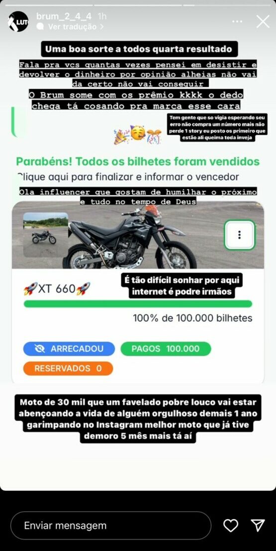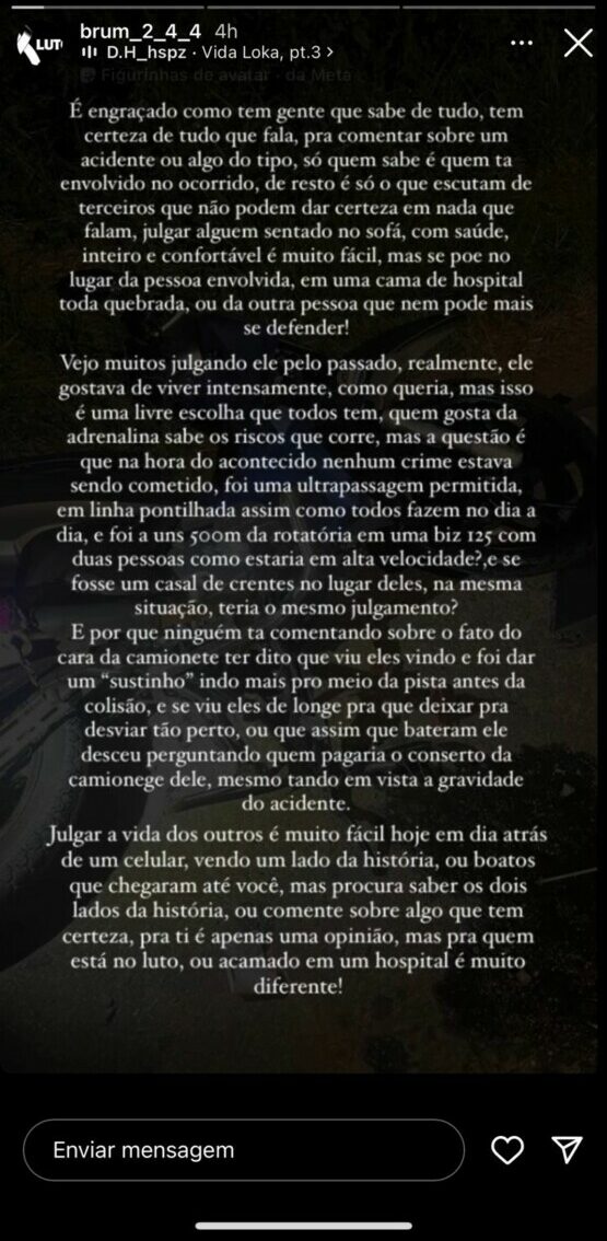 Já Gabriel Brum, de 25 anos, se recupera no hospital. Diante de toda essa tragédia, o jovem ganhou visibilidade e está se tornando influenciador digital, com mais de 36 mil seguidores no Instagram. Ele inclusive está rifando uma motocicleta, modelo XT 660.