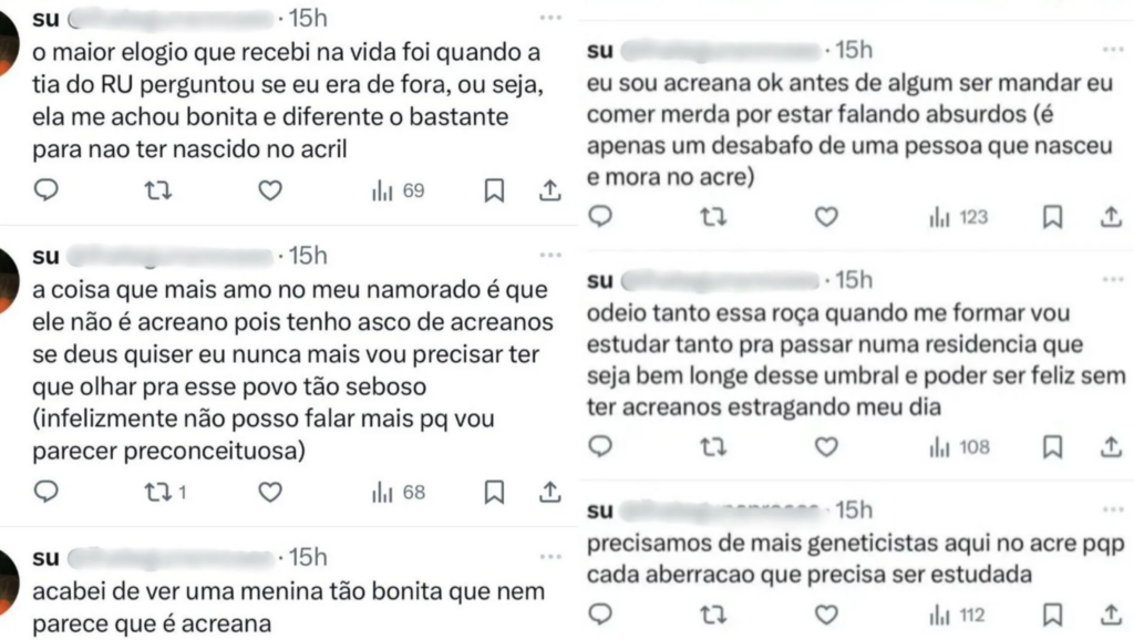 Em suas postagens, a estudante expressou opiniões como considerar um elogio ser confundida com alguém de fora do estado por ser julgada “bonita e diferente o bastante para não ter nascido no acril (sic)”. Em outras ocasiões, afirmou ter “asco de acreanos” e manifestou o desejo de nunca mais precisar olhar para esse “povo tão seboso”.