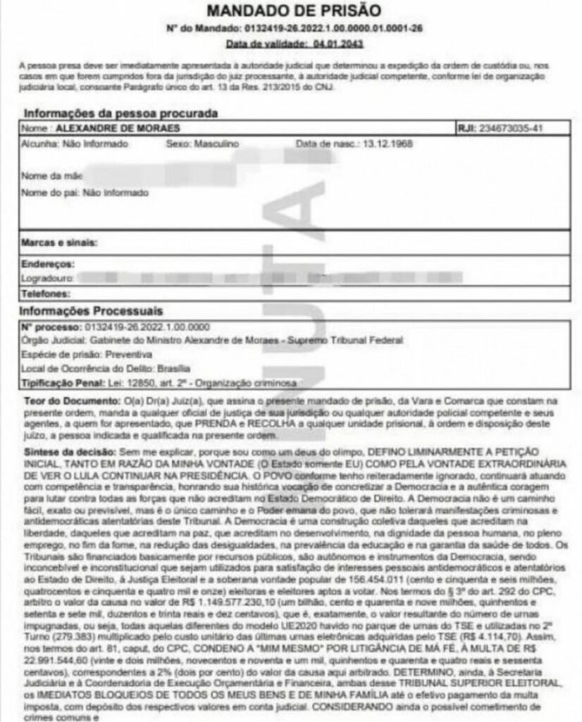 A decisão falsa diz: “expeça-se o competente mandado de prisão em desfavor de mim mesmo, Alexandre de Moraes”.
