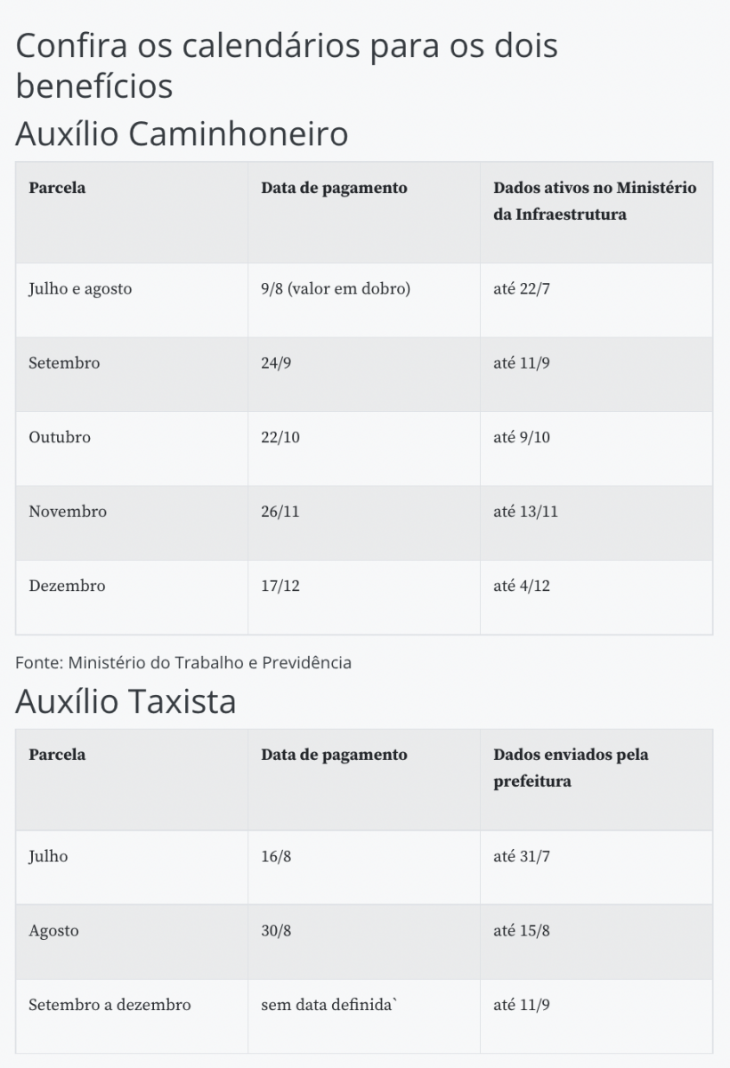 As parcelas de julho e de agosto do Auxílio Caminhoneiro serão pagas juntas em 9 de agosto, somando R$ 2 mil. As demais parcelas, que serão pagas até dezembro, equivalerão a R$ 1 mil. Em relação ao Auxílio Taxista, o limite máximo de cada parcela soma R$ 1 mil, podendo atingir R$ 2 mil em agosto (pagos em datas diferentes no mesmo mês), mas os valores efetivos dependerão do número de taxistas cadastrados pelas prefeituras. Caso haja mais taxistas cadastrados que o previsto, o valor para cada um ficará menor.