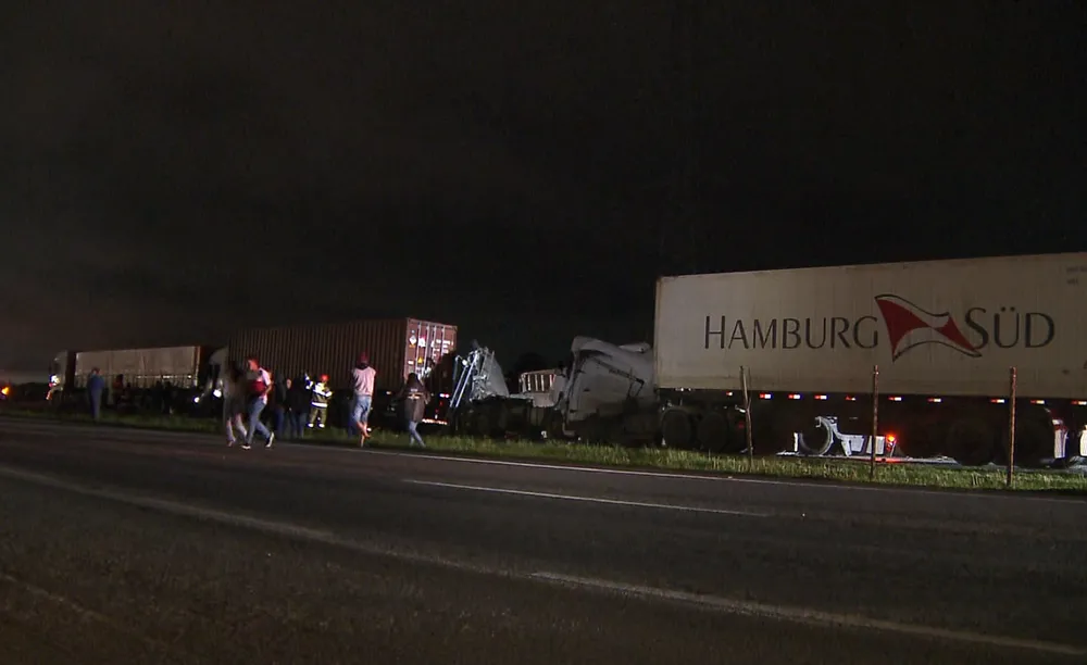 “Um quarto caminhão desgovernado perdeu controle e colidiu com a traseira do terceiro caminhão. colidiu com o container que tinha em cima do caminhão, e esse container amassou a cabine, levando o condutor desse terceiro caminhão a óbito”, explicou o tenente Stofel, do Corpo de Bombeiros.