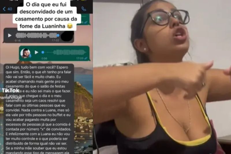 Brasil – Um casal viralizou nas redes sociais após ser desconvidado de um casamento porque a mulher come demais. Hugo e Luana compartilharam um vídeo no TikTok mostrando a mensagem do noivo, que alega que ela “vale por três pessoas” e daria prejuízo à festa.