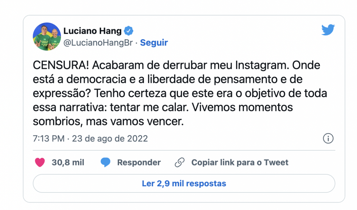 O perfil passou a ficar fora do ar por volta das 20h15 e Luciano comentou o caso em outra rede social. Através do Twitter, o empresário disse que a ação seria uma censura e questionou sobre democracia e liberdade de pensamento e de expressão.