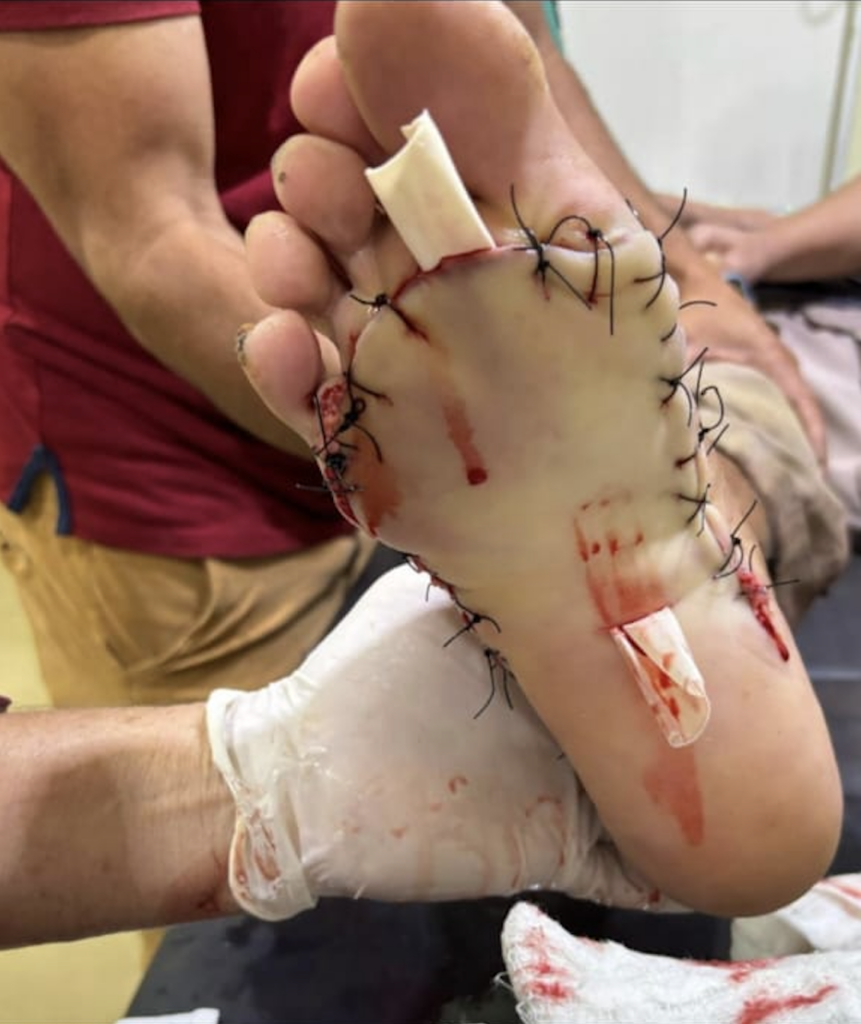 De acordo com relatos, o homem trafegava por uma via movimentada quando foi surpreendido pela linha cortante, que atingiu diretamente seu pé desprotegido. O impacto foi tão severo que ele precisou passar por uma cirurgia, tendo o pé direito completamente costurado pelos médicos.