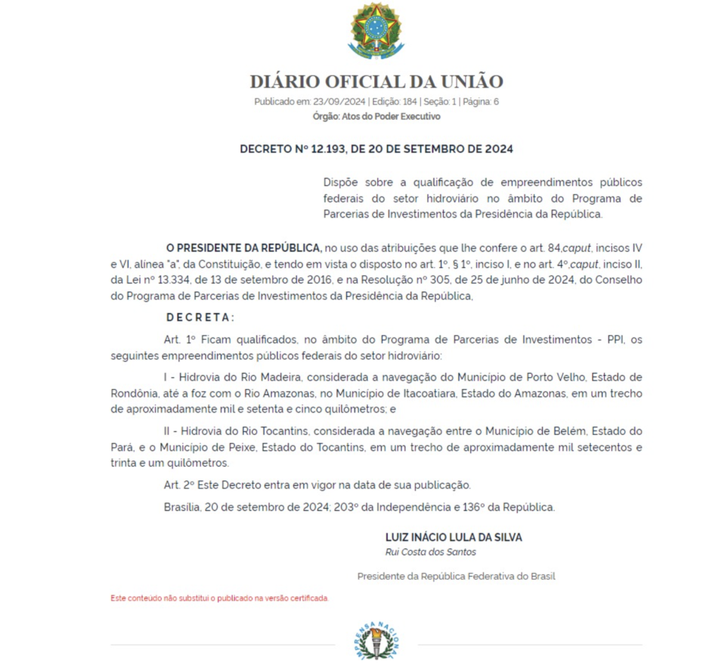 Brasil – Na última sexta-feira (20), o Governo Federal deu um passo significativo a favor da hidrovia no Rio Madeira. O decreto, publicado no Diário Oficial da União, versa sobre a qualificação de empreendimentos públicos federais no setor hidroviário no âmbito do Programa de Parcerias de Investimentos da Presidência da República.
