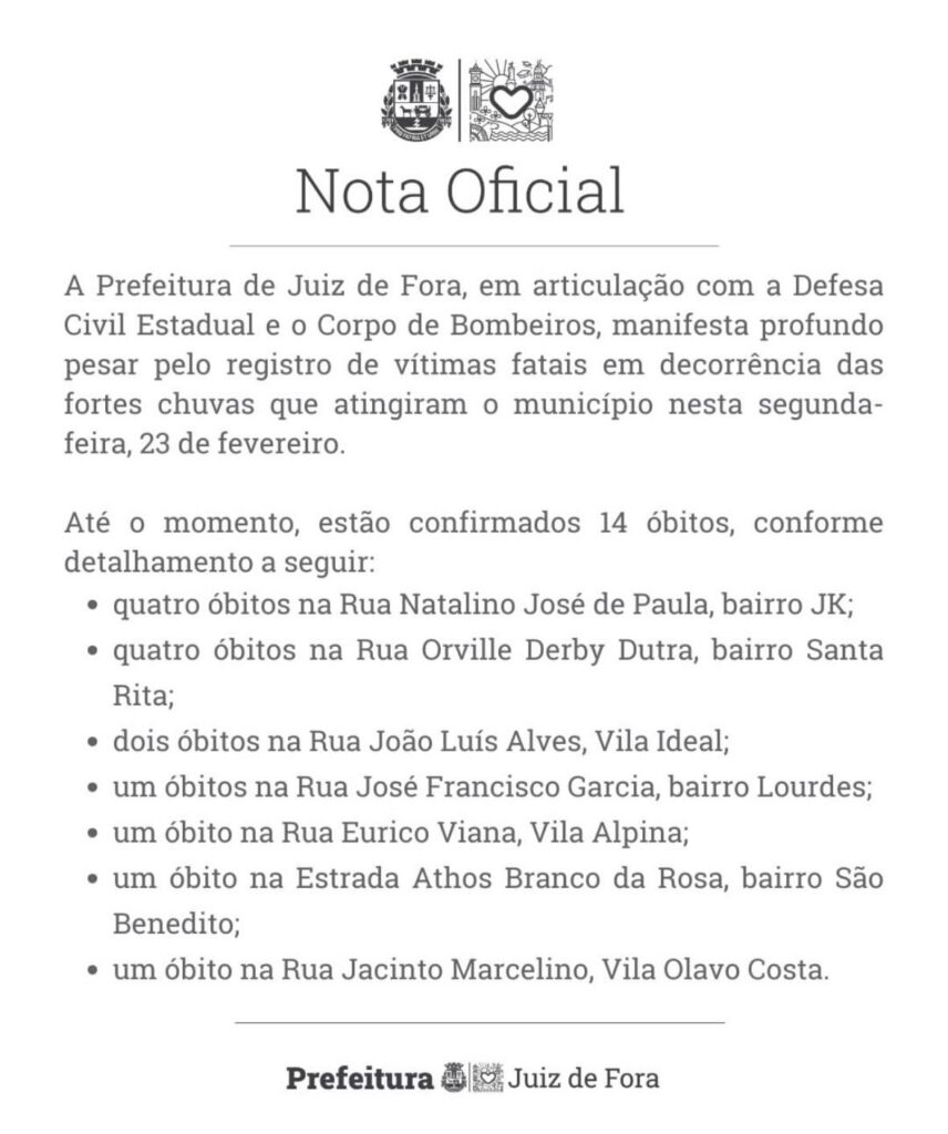 Brasil – Na madrugada desta terça-feira (24), 14 pessoas morreram em decorrência das fortes chuvas que atingiram Juiz de Fora, em Minas Gerais. A prefeitura confirmou os óbitos e informou que as equipes de resgate seguem mobilizadas.