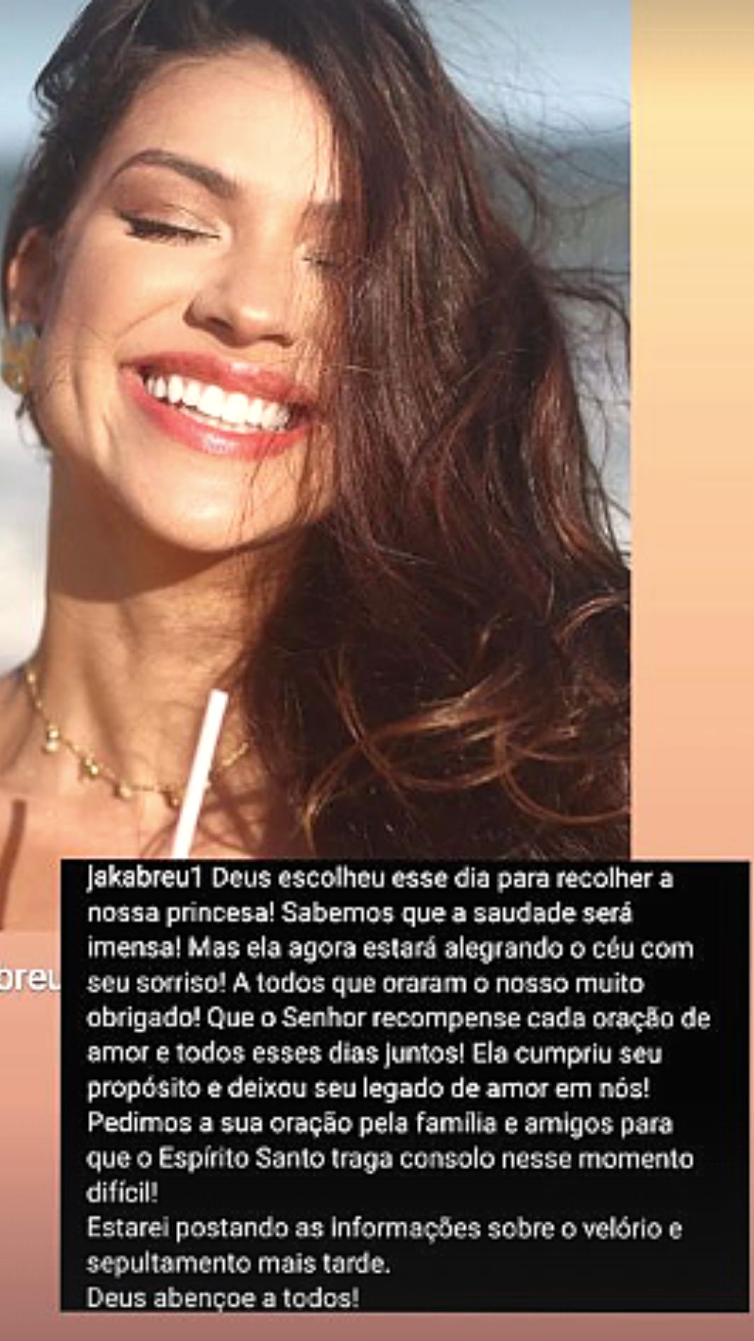 A informação de sua morte foi dada por Jak Abreu, pastor da igreja que a miss frequentava: “Deus escolheu esse dia para recolher a nossa princesa! Sabemos que a saudade será imensa! Mas ela agora estará alegrando o céu com seu sorriso! A todos que oraram o nosso muito obrigado! Que o Senhor recompense cada oração de amor e todos esses dias juntos! Ela cumpriu seu propósito e deixou seu legado de amor em nós! Pedimos a sua oração pela família e amigos para que o Espírito Santo traga consolo nesse momento difícil”, escreveu o pastor.