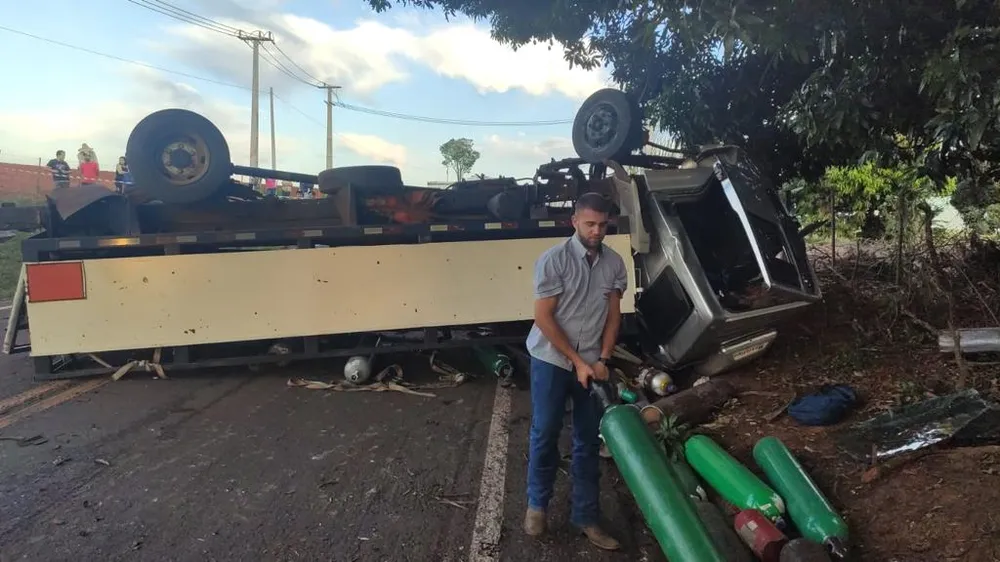 De acordo com a PRE, um caminhão carregado com cilindros de oxigênio bateu contra um carro. Os veículos ficaram destruídos, segundo a polícia.