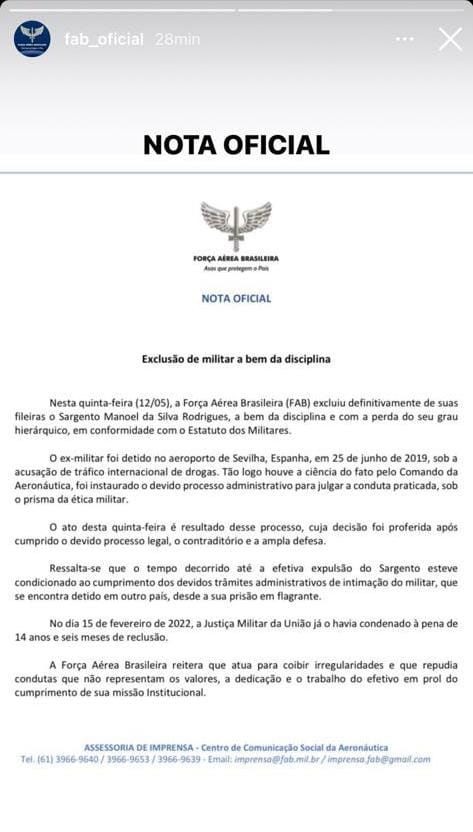 Segundo a FAB, a exclusão de Rodrigues é resultado do processo administrativo aberto para julgar a conduta dele e está “em conformidade com o Estatuto dos Militares”.