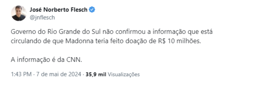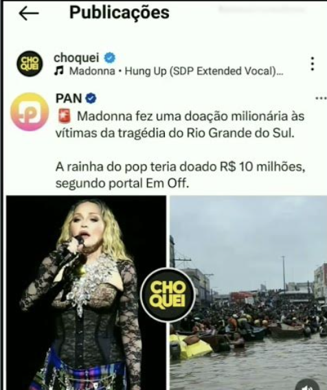 Brasil – Em meio a uma grande corrente de doações vindo de todos os cantos do Brasil e até do exterior, boatos e especulações também se espalham na tragédia do Rio Grande do Sul. Nesta segunda-feira (6) diversos sites republicaram uma nota falsa de que Madonna teria doado R$ 10 milhões para o Rio Grande do Sul.