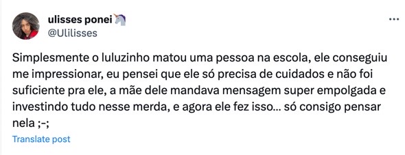Amigos do autor relatam que ele era conhecido por suas atitudes controversas e polêmicas. Além disso, Luluzinho era usuário da plataforma de bate-papo Discord e teria feito apologia a ideologias extremistas. Além disso, informações sugerem que ele também era parte da comunidade LGBTQ+ e que teria recentemente perdido sua melhor amiga, que havia cometido suicídio.