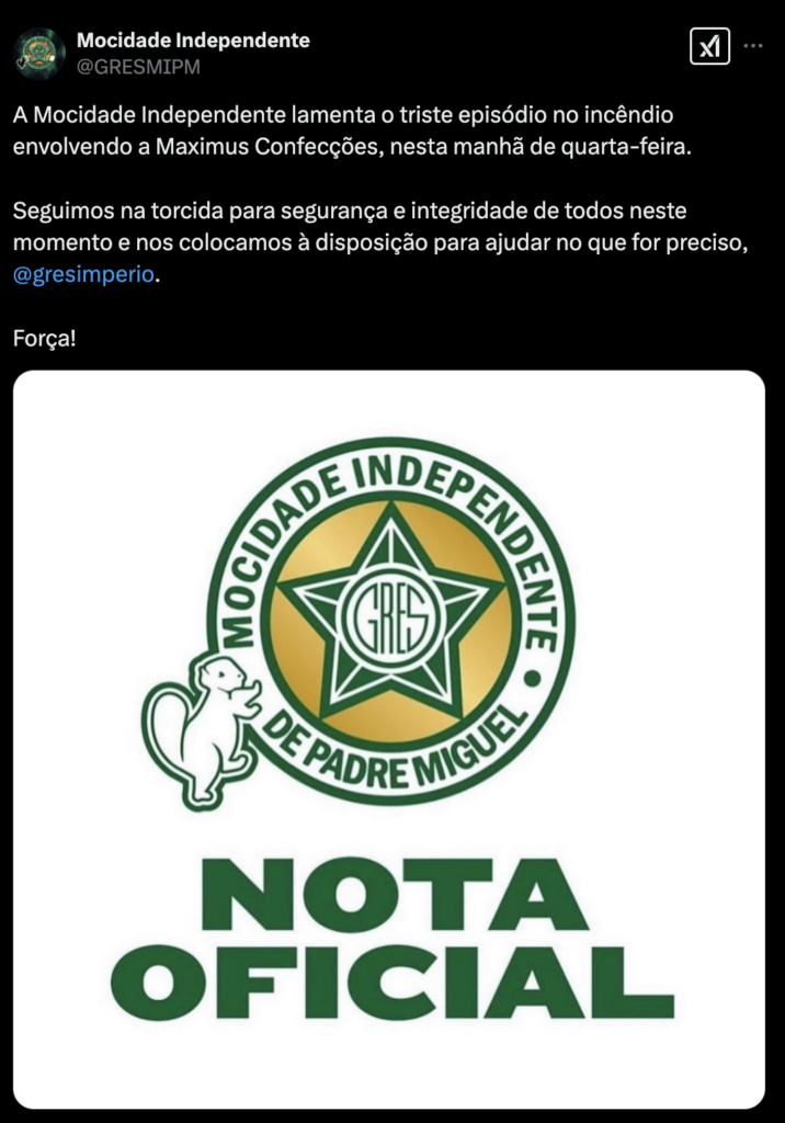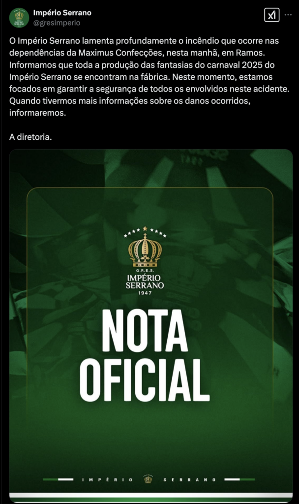 Em nota oficial, a escola de samba Império Serrano confirmou que o incêndio ocorreu na fábrica da Maximus Confecções, onde estavam guardadas todas as fantasias destinadas para o desfile do próximo carnaval. A agremiação não forneceu mais detalhes sobre o impacto do incidente na preparação para o evento.